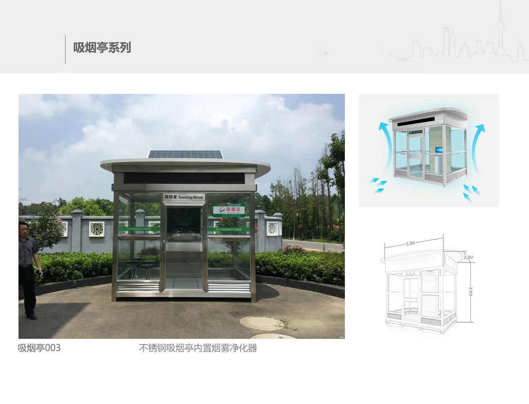 吸煙亭按照功能分室內(nèi)吸煙亭和室外吸煙亭,隨著人們健康意識的加強,原來只有室內(nèi)吸煙亭安裝凈煙設(shè)備,現(xiàn)在室外吸煙亭也可以安裝煙霧凈化器。